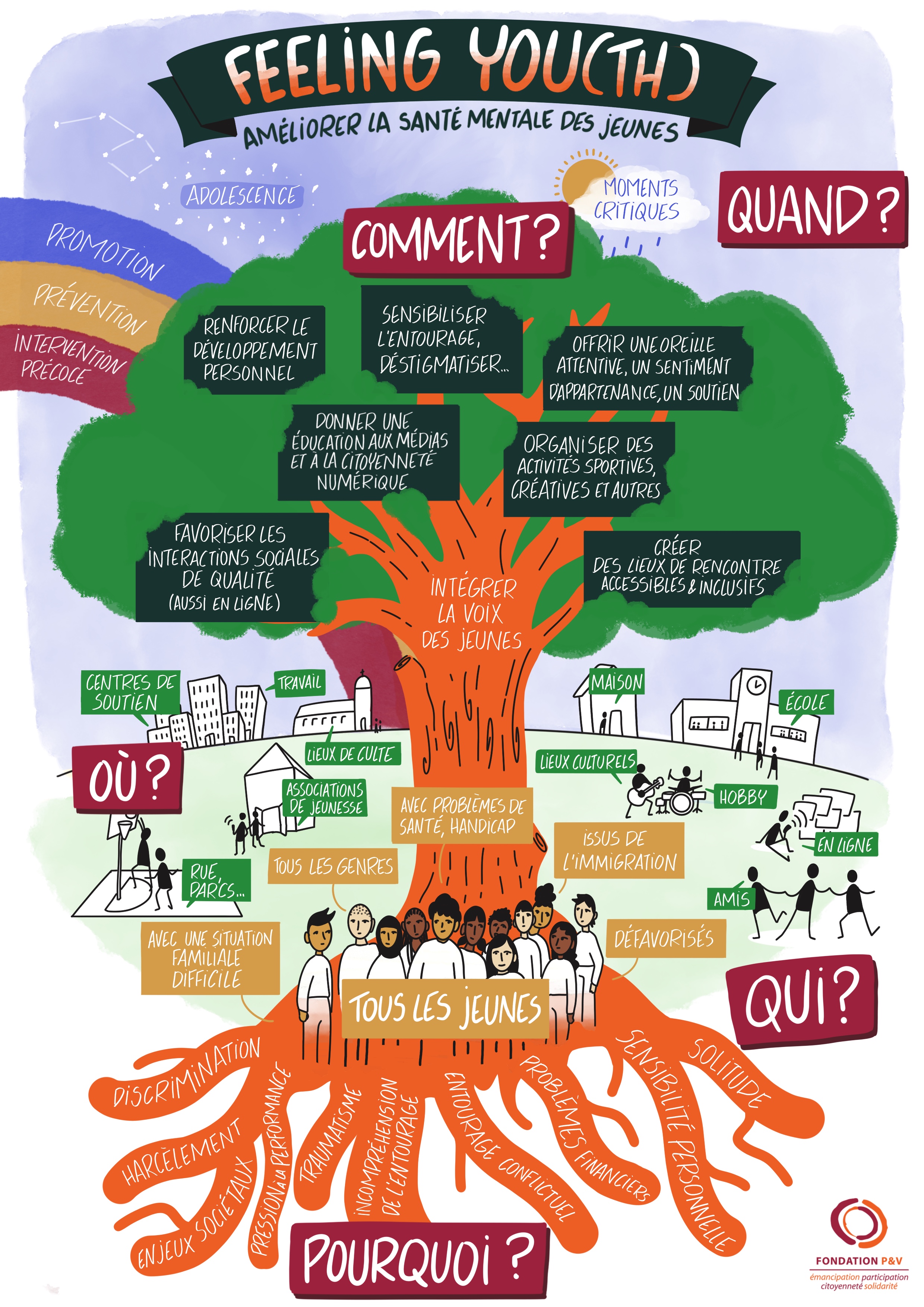 Les jeunes sont confrontés à diverses défis, allant de la pression de performance, des attentes sociales, de la discrimination, du rôle des médias sociaux à la crise climatique. Une intervention précoce (notamment durant l'adolescence et les phases critiques) ainsi que des environnements d'écoute, de soin et de soutien sont cruciaux pour leur développement. Les écoles sont importantes, mais la famille, les groupes d'amis et la communauté au sens large jouent également un rôle clé.